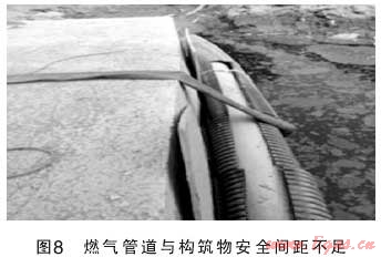 主要表現(xiàn)在:1)對壓力管道安全知識缺乏和對壓力管道有關介質(zhì)(如液化石油氣和天然氣)安全知識貧乏;2)對安全距離重視不足,壓力管道與其它設施距離不符合規(guī)范(GB50028-2006)相關要求,壓力管道與生活設施安全距離不足;3)無安全操作制度或有規(guī)定要求不嚴格執(zhí)行(如圖6、7、8)。
