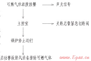 防爆場(chǎng)所的通風(fēng)一般有兩種方式:自然通風(fēng)、機(jī)械通風(fēng)。自然通風(fēng)由建筑專業(yè)設(shè)計(jì)考慮。機(jī)械通風(fēng)由暖通專業(yè)設(shè)計(jì)考慮。在燃?xì)忮仩t房?jī)?nèi)設(shè)計(jì)可燃?xì)怏w濃度報(bào)警裝置和火災(zāi)報(bào)警裝置。可燃?xì)怏w濃度報(bào)警裝置按照可燃?xì)怏w爆炸下限20%設(shè)置報(bào)警點(diǎn),其控制過(guò)程如下: