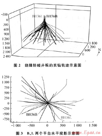 對有可能井眼要發(fā)生干擾的井,全部采用陀螺復(fù)測井眼軌跡,并且全部要進行井眼鄰井程度分析和防碰掃描分析計算。通過對海上原平臺上的已鉆生產(chǎn)井的軌跡測量,了解和掌握了原井眼的準(zhǔn)確位置,同時對于已鉆井和待鉆井的軌跡鄰近程度進行了分析。通過防碰掃描分析,可以看出:對相鄰的8平臺而言,在500~900m范圍內(nèi)井眼中心距在18~20m不等,而這一井段還是原平臺在200~550m造斜井段的井眼和方位變化最大的井段,要引起全面重視。圖2是原B平臺叢式井組與先加密現(xiàn)加密L平臺叢式井組示意圖(兩個平臺中心距45m),圖3則是兩個平臺水平投影示意圖。