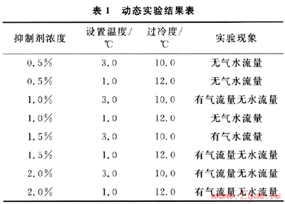 為了更好地模擬現場的真實情況,評價抑制劑的抑制性能,為現場提供正確指導,模擬井筒和長輸管線中的水合物堵塞情況,進行了不同過冷度、不同抑制劑濃度下的流動實驗,研究不同濃度的抑制劑的抑制效果。實驗共測定了4個濃度、2個過冷度下的水合物堵塞情況,其結果如表1所示。