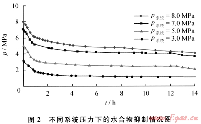配制甲醇在純水溶液中的濃度為20%,抑制劑濃度為1.5%,體系壓力恒定在5.0MPa,測定時體系壓力、時間的變化關系如圖6所示。