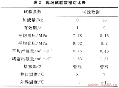 第二階段(加注新型抑制劑50kg)。除15日產液1.51m3,其余時間產液相對較少,且從12日起,溫度開始持續(xù)降低,15日堵塞當天最低溫度為-18℃,最高溫度也才6℃。分析認為,造成堵塞的原因為出液量突然增大使得抑制劑在產出液中的濃度降低,再加外界溫度很低,從而造成連續(xù)堵塞。即使如此本階段在加注新型抑制劑后,有效抑制期依然有9d,可見效果較好,其試驗數據對比結果如表2所示。