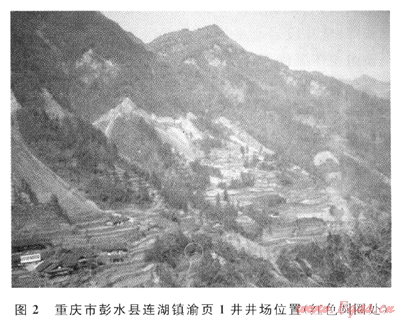渝頁1井位于七曜山東部,該處沿北北東走向的群山連綿起伏,形成了與地質(zhì)構(gòu)造特點大體一致的地理景觀。由于構(gòu)造斷裂、剝蝕風(fēng)化及徑流沖刷等地質(zhì)作用,背斜核部常表現(xiàn)為溝、槽、谷等地形特征,與向斜核部在地表上的峰、嶺、脊等地形特征形成明顯對比。由于北東-南西和北西-南東方向的兩組斷裂在該地區(qū)同時發(fā)育,故地質(zhì)、地貌特征變化復(fù)雜。渝頁1井位于重慶市彭水縣連湖鎮(zhèn)北西西290°方位2~3km的曹家溝,屬連湖鎮(zhèn)樂地壩村所轄。區(qū)內(nèi)地形為北西高南東低,溝壑縱橫,相對高差1000m左右,其中渝頁1井位于山間河流切割沖刷所形成的“V”字形溝槽中(圖2)。