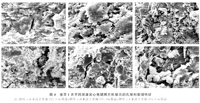 渝頁1井龍馬溪組黑色頁巖宏觀及微觀裂縫發(fā)育,宏觀裂縫可分為高角度、近水平及雜亂狀3類,可表現(xiàn)為充填、半充填或無充填。一般裂縫多呈高角度延伸,巖心中可見的單一裂縫長度為1.6m。觀察結(jié)果表明,各類裂縫多表現(xiàn)為不均一的集中分布特點,充填與不充填裂縫常有繼承性發(fā)育特點。巖心樣品電鏡掃描特征顯示,黑色頁巖微孔隙和裂縫發(fā)育,孔隙直徑一般為1~5μm,少數(shù)介于1~8μm,微裂縫規(guī)模在10~25μm(圖4)。泥頁巖儲層儲集空間包括了黏土礦物粒間微孔隙(圖中b和d)、頁理間孔隙(圖中b)、溶蝕孔隙(圖中c和d)、成巖微裂縫(圖中f)及構(gòu)造裂縫(圖中a和e)等。