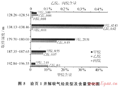 渝頁1井提撈的黑色巖心均為不含地層水的“干層”,即不含地層水(包括束縛水)的含氣層,若將隨機選取的巖心置于水中,則均將發(fā)生針尖狀氣泡不斷溢出的現(xiàn)象,視為頁巖氣的最直接證據(jù);此外,在鉆進過程中,還多次在井筒中發(fā)現(xiàn)了氣泡溢出以及井口空氣中甲烷含量異常等現(xiàn)象,證實了頁巖中天然氣的直接存在。同時,渝頁1井的16塊樣品現(xiàn)場解析表明,位于281.Om和287.5m井深處樣品的含氣量現(xiàn)場解析值最高,計算現(xiàn)場解析氣量達到并超過0.1m3/t(解析持續(xù)時間為6h)。考慮到井筒提心時間較長(4.2h)、損失氣量及殘留氣量較多等原因,再結(jié)合已有解析曲線的比較研究,推測頁巖吸附含氣量大于1.0m3/t。結(jié)合頁巖總含氣量分析原理,初步計算頁巖總含氣量(吸附氣+游離氣)介于1.0~3.Om3/t之間,視為具有工業(yè)價值的頁巖氣。進一步的色譜分析結(jié)果表明,天然氣樣品中同時含有甲烷和乙烷,在128.23~138.46m和206.75~209.18m井深等樣品中還發(fā)現(xiàn)了丙烷的存在(圖5)。其中,138.13~138.46m井深樣品中的甲烷、乙烷和丙烷含量分別為42.43%、0.42%、0.01%,其余為N2、CO2和O2等大氣成分。解吸樣品中烴類氣體含量的百分比并不高,可能主要反映為解析儀中空氣樣品的殘留或地下風(fēng)化帶中少量空氣成分的進入。