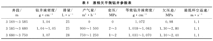 2) 提高了機(jī)械鉆速,延長(zhǎng)鉆頭壽命。欠平衡鉆進(jìn)過(guò)程中,鉆井液循環(huán)壓力低于地層壓力,消除了正壓差對(duì)巖屑的壓持效應(yīng),避免了巖石的重復(fù)研磨,提高了機(jī)械鉆速,延長(zhǎng)了鉆頭壽命。欠平衡井段3569.2~3750.0m,進(jìn)尺180.80m,純鉆進(jìn)86.67h,平均機(jī)械鉆速2.09m/h,使用萬(wàn)216mm牙輪鉆頭一只,鉆時(shí)超過(guò)6m/h的段長(zhǎng)就有31m。