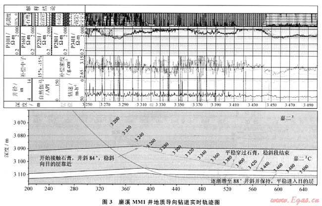 為避免鉆進(jìn)石膏層時(shí)發(fā)生卡鉆,設(shè)計(jì)開始以4°狗腿造斜并在3300m把井斜增加到84°,之后保持井斜向目的層接近,并以旋轉(zhuǎn)鉆進(jìn)的方式來通過目的層上方的石膏層。在3440m鉆速由4.8m/h增加到8.4m/h,密度由2.99g/cm3減小到2.84g/cm3,中子增加到5.4%,電阻率也由1000Ω·m下降到200Ω·m,用校正后的中子和密度交會(huì)得到孔隙度為6%~10%,巖性為白云巖。結(jié)合鄰井測井資料和區(qū)域地質(zhì)資料,通過地層對比地層,綜合判斷3440m已進(jìn)入目的層,其后井斜逐漸增至88°并保持穩(wěn)斜(圖3)。
