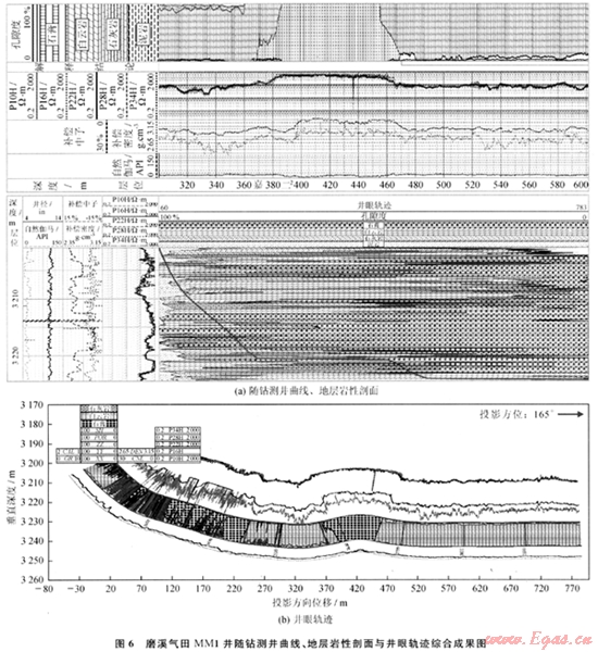 摘要:隨鉆地質(zhì)導(dǎo)向技術(shù)實(shí)現(xiàn)了以井下實(shí)際地質(zhì)特征來確定和控制井眼軌跡,達(dá)到了提高有效儲(chǔ)層鉆遇率的目的,對于高效開發(fā)復(fù)雜氣藏具有重要意義。為此,簡述了地震、測井聯(lián)合反演和三維可視化建模在地質(zhì)導(dǎo)向儲(chǔ)層預(yù)測中的作用,然后結(jié)合四川盆地中部磨溪?dú)馓颩M1水平井等多口井的產(chǎn)層導(dǎo)向鉆進(jìn)情況,總結(jié)出采用隨鉆測井(LWD)資料確定中靶點(diǎn)和鉆頭在目的層的位置,以及井眼軌跡、地層巖性剖面和隨鉆測井曲線綜合成圖與調(diào)整井眼軌跡等方法,并以此來指導(dǎo)磨溪?dú)馓锶B系嘉陵江組白云巖儲(chǔ)層的地質(zhì)導(dǎo)向鉆井施工,明顯提高了水平井目的層的鉆遇率和地質(zhì)導(dǎo)向鉆井的成功率,效果良好,值得推廣應(yīng)用。