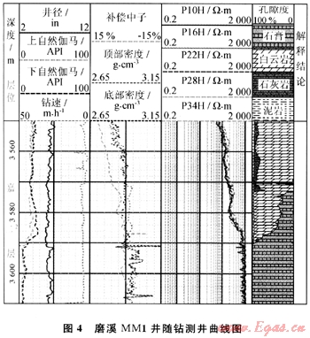 為調(diào)整鉆頭使其回到目的層,現(xiàn)場決定以7。狗腿減小井斜。經(jīng)過降斜到90°,鉆至3664m發(fā)現(xiàn)鉆速由3.8m/h增加到7.4m/h,密度由2.95g/cm3減小到2.80g/cm3,補(bǔ)償中子增加到7.7%,電阻率也由1800Ω·m降到200Ω·m,用校正后的中子和密度交會(huì)得到孔隙度為6%~10%,巖性為白云巖。表明儀器已經(jīng)由上部石膏層鉆回目的層。