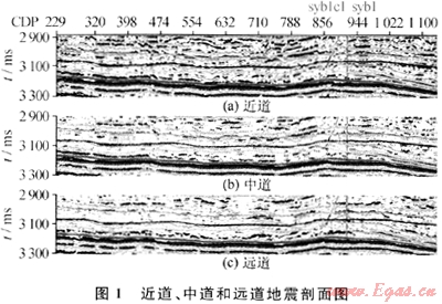對3個數(shù)據(jù)體進行頻譜分析,近道頻率范圍在4.32~80.37Hz之間,中道在4.32~64.24Hz之間,遠道在4.77~60.77Hz之間,也就是說近道的剖面分辨率最高,中道次之,遠道分辨率最低。在圖1中,可以看出近道剖面顯示出的細節(jié)性要比遠道剖面清晰得多,中道好于遠道而差于近道。