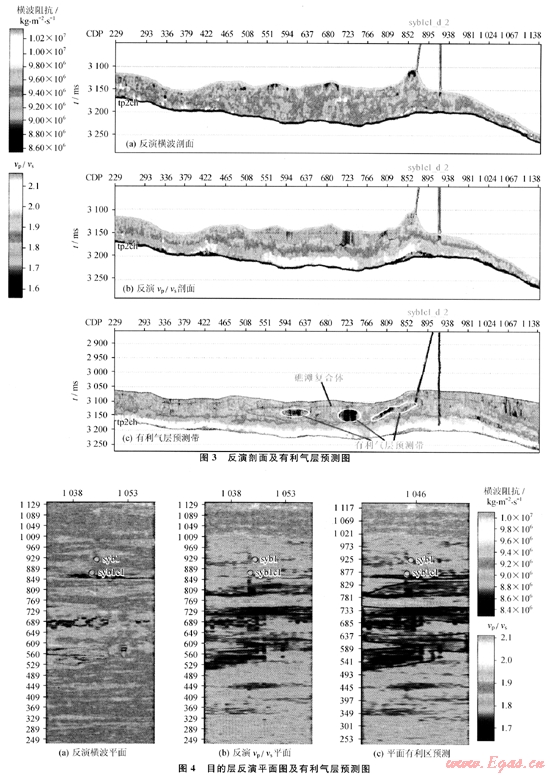 從反演結(jié)果(圖3-a,圖3-b,圖4-a,圖4-b)以及井曲線的敏感屬性分析可以得到,syb1井在目的層段的多種屬性基本上表現(xiàn)出不是良好的儲氣層段,而 syb1c1井的井底位置恰好在多種屬性分析上都表現(xiàn)出是良好的儲氣層段。這也直接驗證了syb1井是低產(chǎn)井,而syb1c1井是一個高產(chǎn)氣井的客觀事實。對于本區(qū)含氣儲層段,橫波阻抗和vp/vs屬性是檢測氣藏非常好的2個參數(shù),因此,選擇橫波阻抗和vp/vs屬性體進行有利氣層預(yù)測。圖3-c和圖4-c是有利氣層預(yù)測的過井剖面圖及目的層平面上有利氣層預(yù)測圖。