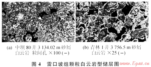 發(fā)育風(fēng)化殼巖溶型白云巖和顆粒白云巖2類(lèi)儲(chǔ)層,前者見(jiàn)于盆地中部地區(qū),以LG雷四段為代表;后者發(fā)育于雷一段和雷三段,以中壩氣田最為典型[17],下面分別討論其特點(diǎn)。