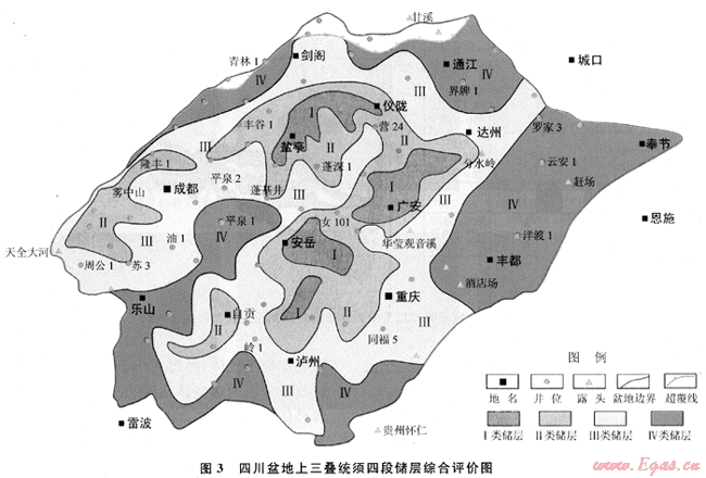 對影響儲層發(fā)育的3個主要因素(沉積相、巖石相和成巖相)進(jìn)行研究和評價,分別編制出3個儲層段的沉積相平面圖、巖石相平面圖和成巖相平面圖,并評價有利相區(qū)的展布。在此基礎(chǔ)上,根據(jù)低孔低滲儲層分類評價標(biāo)準(zhǔn),將須家河組儲層綜合分為4類,分3個儲層段進(jìn)行綜合評價,認(rèn)為Ⅱ-Ⅲ類儲層大面積分布(圖3)。