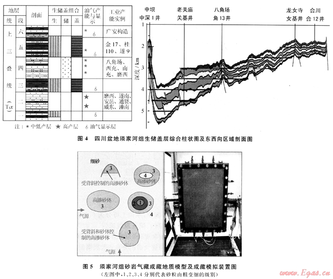 3) 綜合分析須家河組氣源巖、生儲蓋層空間配置等油氣地質(zhì)條件,評價烴源巖生烴潛力。結(jié)合氣藏解剖,首次開展氣水置換的成藏模擬試驗,認(rèn)為砂巖儲層物性的相對差異是能否聚氣的關(guān)鍵。