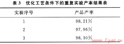 為了驗證正交實驗優(yōu)化出來的工藝條件的可靠性,在該條件下又進行了3次重復實驗,得到的產(chǎn)率結果如表3所示。