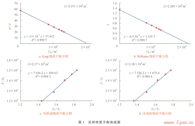 根據(jù)上述數(shù)據(jù),利用King物質(zhì)平衡方程、williams物質(zhì)平衡方程、劉鐵成物質(zhì)平衡方程及筆者提出的改進(jìn)的物質(zhì)平衡方程,計算了該實例頁巖氣井的原始地質(zhì)儲量(圖1)。