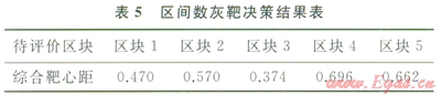 投影長度(xij*)記為綜合靶心距。綜合靶心距計算結(jié)果如表5所示。由區(qū)間數(shù)灰靶決策模型得到的結(jié)果為:x*=min(xij*)=0.374。該結(jié)果對應的足區(qū)塊3。因此,區(qū)塊3為資源勘探開發(fā)潛力評價最優(yōu)區(qū)塊。