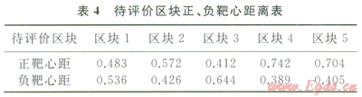5個待評價區(qū)塊向量距離正、負靶心之間的距離如表4所示。
