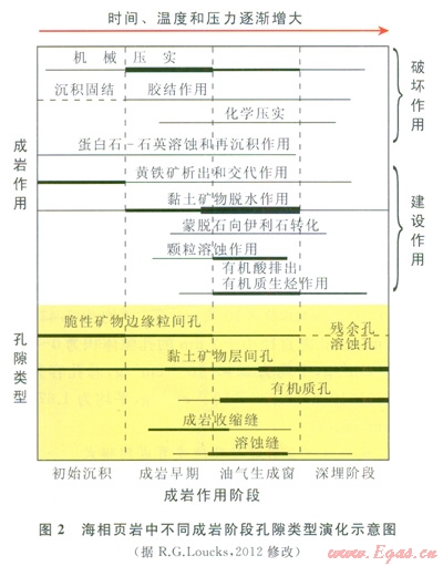 頁巖中孔隙的形成受多種因素控制,包括沉積原始礦物組成、結(jié)構(gòu)、構(gòu)造、有機質(zhì)含量、流體、水文條件以及沉積速率和埋藏深度[13]。其中,成巖演化作用是重要的影響因素,在不同成巖作用階段孔隙演化特征不同(圖2)。沉積初期主要是機械堆積成岡的粒間孔。隨著埋深及上覆地層壓力增大,松散沉積物固結(jié)成巖,地層中的流體快速排出,有機質(zhì)開始生物降解。粒間孔逐漸減少,塑性顆粒變形充填到粒間孔中加劇了孔隙的損失[13]。隨埋深進一步增加,進入大量生排烴階段(油氣生成窗),生烴后有機質(zhì)體積縮小以及氣體生成時體積膨脹造成有機質(zhì)中產(chǎn)生大量孔隙[14],同時在生烴的過程中產(chǎn)生大量的有機酸、CO2和水。易溶礦物顆粒(如方解石、長石)發(fā)生溶蝕作用形成溶蝕孔或溶蝕縫。同時黏土礦物發(fā)生一系列成巖變化,以蒙脫石向伊利石(或綠泥石)的轉(zhuǎn)化最為重要。在這個變化過程中,伴隨著礦物結(jié)構(gòu)和化學(xué)組成的變化,析出大量層間水。由于黏土礦物脫水作用,形成了大量的黏土礦物層間孔和成巖收縮縫。有機酸溶解的鈣質(zhì)礦物和黏土礦物脫水析出的鈣質(zhì)礦物易在溶蝕縫、成巖收縮縫及層間頁理縫中形成鈣質(zhì)沉淀,微裂縫多被方解石充填。