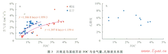 有機質(zhì)利于頁巖氣的吸附[15],有機質(zhì)含量越高吸附氣量越大(圖3-a),同時有機質(zhì)還有利于孔隙的形成[16]。有機質(zhì)孔的形成是在油氣生成過程中,有機質(zhì)體積縮小及氣體體積膨脹[17-18],并隨著地溫的升高及熱成熟度的增加隨之增多[12,19]。有研究發(fā)現(xiàn),在熱裂解作用下,有機質(zhì)損失35%可形成4.9%的凈有效儲集空間[20]。但有機質(zhì)豐度與頁巖孔隙度并不存在相關(guān)關(guān)系(圖3-b),這與有機質(zhì)孔之間相互連通性較差有關(guān)。