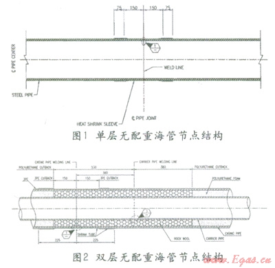 不同結(jié)構(gòu)的海管也有多種不同結(jié)構(gòu)的節(jié)點(diǎn),無(wú)配重海管的普通節(jié)點(diǎn)結(jié)構(gòu)如圖l、2所示。此外常見(jiàn)的海管還有單層配重管、單層保溫管、雙層配重管等多種結(jié)構(gòu)。