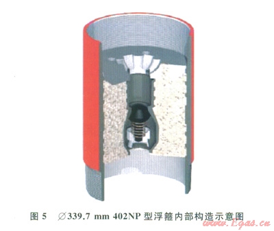 Æ339.7mm和Æ508.0mm的套管鉆井所使用的浮箍,前者的型號為402NP型(圖5),后者的型號為402型。這2種浮箍的最大特點是:超密Ⅲ型(Sure-Seal 3TM)單流閥,性能優(yōu)良,可以耐受長時間大排量鉆井液的沖刷。另外402NP型有l個花瓣狀的承接盤,可以保證在下一次開鉆被鉆掉時,膠塞不發(fā)生旋轉[12-14]。