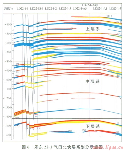 樂東22-1氣田儲層為第四系樂東組和新近系鶯歌海組,從上到下依次為樂東組一段、二段、三段和鶯歌海組一段,埋深350~l600m,地層壓力4.0~16.2MPa。天然氣純烴含量樂東組相近,平均為82%,而鶯歌海組則分布較為復(fù)雜,明顯具有分區(qū)分塊性。驅(qū)動類型方面,除樂東組一段為底水驅(qū)動外,其他均為層狀邊水驅(qū)動。儲層物性上Ql1V下氣組屬中高孔高滲氣藏,其他氣組均屬中孔中低滲氣藏。儲量規(guī)模上Ql1V上、Ql1V下、Ql2Ⅲ、N2y1Ⅰ及N2y1Ⅱ氣組較大。因此,根據(jù)氣田縱向上各氣組的壓力、天然氣組分、驅(qū)動類型、儲量規(guī)模等差異,通過合理劃分層系來減少多層合采帶來的層間干擾[9],將氣田劃分為3套層系,圖6為氣田北塊層系劃分示意圖,上層系為Ql1Ⅱ—Ql1Ⅳ,中層系為Ql2Ⅰ—Ql3Ⅱ,下層系為N2y1Ⅰ—N2y1Ⅱ。