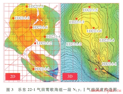 樂東22-l氣田三維地震解釋與二維解釋的構(gòu)造認(rèn)識發(fā)生了較大變化,以N1y2Ⅰ,工氣組為例,原二維資料解釋存在“Y”形斷層,但在三維資料解釋后斷層并不存在(圖3)。另外,三維地震解釋后部分主力氣組的構(gòu)造高點和幅度也發(fā)生了明顯的變化。為了減少構(gòu)造對氣田開發(fā)的影響,進行了儲層精細(xì)描述,并以此來優(yōu)選井位和指導(dǎo)隨鉆井軌跡調(diào)整,為氣田開發(fā)成功實施奠定了基礎(chǔ)。