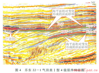 樂東22-1氣田主物源來自北東方向的海南島,為發(fā)育在陸架濱 淺海背景下,受沉積坡折控制的灘壩復(fù)合體沉積。儲層的形成,與海平面短期快速升降、強制性海退背景下形成的4級層序有關(guān)。4級層序界面以類工型界面為主,層序結(jié)構(gòu)主要表現(xiàn)為前積型特征,頂積層較薄(圖4)。S型疊加4級層序的頂積層可形成良好的儲集層,在沉積坡折以下多以淺海相泥巖、泥質(zhì)粉砂巖為主,儲層不發(fā)育(圖5)。準(zhǔn)確把握層序形成機制和疊加樣式[7-8],可以有效地預(yù)測和把握有利儲層的分布,減少儲層預(yù)測上的失誤,降低風(fēng)險。通過對儲層的精細(xì)描述,刻畫有利砂體的展布,指導(dǎo)生產(chǎn)井的部署和井位優(yōu)化。