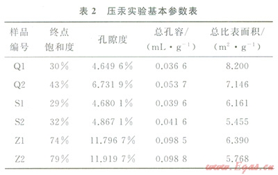 測(cè)試儀器為美國(guó)麥克爾儀器公司生產(chǎn)的Auto pore 9505全自動(dòng)壓汞儀,工作壓力范圍為0.000689413.79MPa,孔徑測(cè)量范圍為5360000nm,汞能進(jìn)入的最小半徑為3nm。計(jì)算機(jī)控點(diǎn)式測(cè)量,高壓段選取壓力點(diǎn)36個(gè),每點(diǎn)穩(wěn)定時(shí)間2s,樣品測(cè)試質(zhì)量3g左右。
