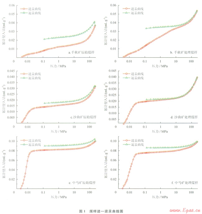 1)煤樣經(jīng)ClO2處理后進(jìn)—退汞曲線開(kāi)口變小,說(shuō)明了煤樣的退汞效率提高,孔隙連通性增強(qiáng),3種不同煤階處理煤樣的退汞效率比原煤樣均有所增加。在相同壓力下,3種不同煤階處理煤樣的進(jìn)汞量均有增加,表明煤樣的孔隙度增加。