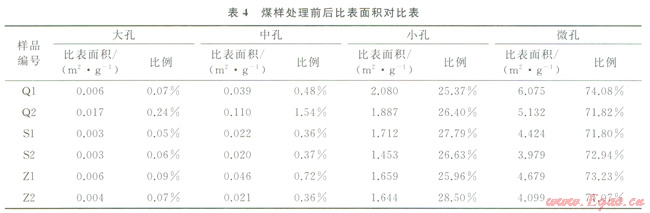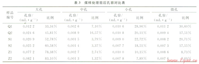 3)3數(shù)據(jù)表明,大孔和中孔的孔容比均有增大,表明了處理后煤的孔裂隙得到了擴(kuò)容,連通性增強(qiáng),改善了儲(chǔ)層滲透性;表4數(shù)據(jù)表明小孔和微孔的比表面積比均有減小,表明煤對(duì)瓦斯的吸附容積減小,從而降低了煤對(duì)甲烷的吸附能力。