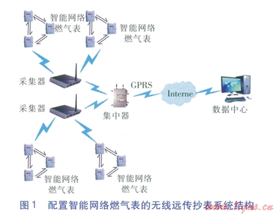 配置智能網(wǎng)絡(luò)燃?xì)獗淼臒o線遠(yuǎn)傳抄表系統(tǒng)結(jié)構(gòu)見圖l。無線遠(yuǎn)傳抄表系統(tǒng)包括智能網(wǎng)絡(luò)燃?xì)獗?、采集器、集中器、?shù)據(jù)中心等。