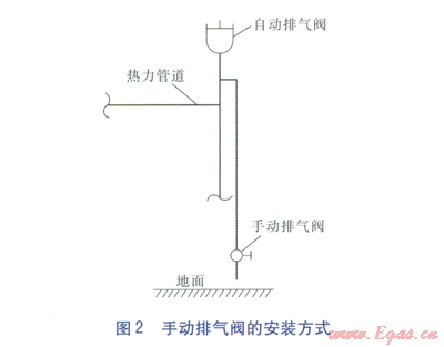 在原有自動排氣閥的基礎上,增設一個手動排氣閥,具體安裝方式見圖2。在自動排氣閥前的排氣管引出一根支管至地面附近,在支管末端安裝一個手動排氣閥。在換熱機組啟動前,運行人員打開手動排氣閥,快速排除管道內的不凝性氣體,直至供回水壓力穩(wěn)定且僅有水而無氣體排出時,再關閉手動排氣閥。此后,可完全依靠自動排氣閥排氣,這樣即可確保換熱機組的安全穩(wěn)定運行。