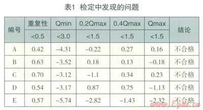 一批準(zhǔn)確度等級(jí)為l.5級(jí)的腰輪流量計(jì)經(jīng)維修組裝完成后,沒(méi)有通過(guò)模擬運(yùn)行工作臺(tái)跑活,送往檢測(cè)中心進(jìn)行檢定,檢定結(jié)果顯示,其中5臺(tái)表具的重復(fù)性和點(diǎn)誤差數(shù)據(jù)不合格(1)。