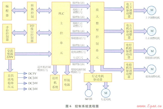 通過手持控制器可選擇具體的焊接工序及各種控制按鈕,經(jīng)I/O總線進(jìn)行控制命令的發(fā)送(圖6)。所有焊接參數(shù)均寫入編程器中,并通過轉(zhuǎn)換控制單元傳輸。信號(hào)最終傳輸給PLC主控單元進(jìn)行處理,經(jīng)放大給整形單元整形后傳輸給各電機(jī)驅(qū)動(dòng)器,進(jìn)而對(duì)相應(yīng)電機(jī)進(jìn)行運(yùn)動(dòng)控制。