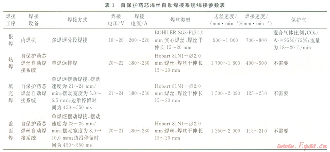 自保藥芯焊絲自動(dòng)焊接系統(tǒng)的焊接參數(shù)見表1。