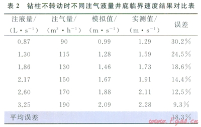 臨界流速是指巖屑發(fā)生躍移時(shí)的最低混合物流速。在達(dá)到臨界攜巖的狀態(tài)下,實(shí)測了氣液兩相混合真實(shí)攜巖臨界速度,再與多相流數(shù)值模擬軟件計(jì)算出的臨界混合速度對(duì)比,得出兩者的誤差。表l、2為鉆柱轉(zhuǎn)動(dòng)和鉆柱不轉(zhuǎn)動(dòng)時(shí)的結(jié)果對(duì)比。
