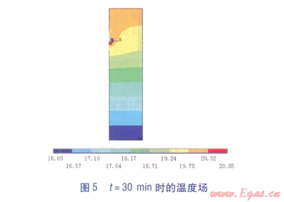 由圖3可以看出,土壤溫度場(chǎng)在剛開始時(shí)呈自然分布,溫度場(chǎng)最高溫度在管道中心。傳熱從初始時(shí)刻開始至1.5h,管道對(duì)土壤溫度場(chǎng)的影響范圍逐漸增大,最高溫度仍然在管道中心,最高溫度逐漸降低,如圖4~6所示,當(dāng)時(shí)間為3min時(shí),最高溫度為30.397℃,30min時(shí),最高溫度降為20.851℃,l.5h時(shí),最高溫度下降至20.213℃;當(dāng)時(shí)間為l.5h(見圖6)時(shí),埋地管道的溫度基本與周罔土壤溫度相當(dāng),說明傳熱基本達(dá)到平衡;當(dāng)傳熱進(jìn)行到12h(見圖7)和24h(見圖8)時(shí),埋地管道溫度場(chǎng)基本與1.5h時(shí)的溫度場(chǎng)相同,最高溫度出現(xiàn)在土壤上表面。
