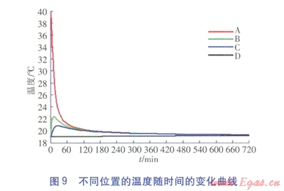 分別取管道中心A、管道外壁B、水平方向距管道0.1m處土壤C及水平方向距管道0.5m處土壤D這4個(gè)點(diǎn),得到各點(diǎn)處溫度隨時(shí)間的變化曲線,見圖9。