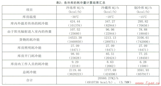 每個工作人員產(chǎn)生的熱量與庫房溫度有關(guān)。凍結(jié)間按l.59MJ/h(355kcal/h),低溫冷藏間按1.26MJ/h(300kcal/h),高溫冷藏庫按1.00MJ/h(240kcal/h)考慮。工作人員按50人考慮。計算可得三座冷庫庫房內(nèi)工作人員產(chǎn)生的耗冷量分別為9.29MJ/h、8.63MJ/h、6.28MJ/h(2218kCal/h、2062kCal/h、1500kcal/h)。將各個冷庫耗冷量的計算結(jié)果匯總,列于表2。