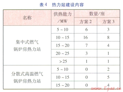 分散式燃氣鍋爐房(低溫、高溫)占地面積較小,可通過小區(qū)配套設施建設落實。集中式燃氣鍋爐房占地面積雖然較大,但需要落實的建設用地數(shù)量相對較少,熱力站的建設用地可通過小區(qū)配套設施建設落實。因此,方案1~3均存在需要落實數(shù)量較多建設用地的問題。