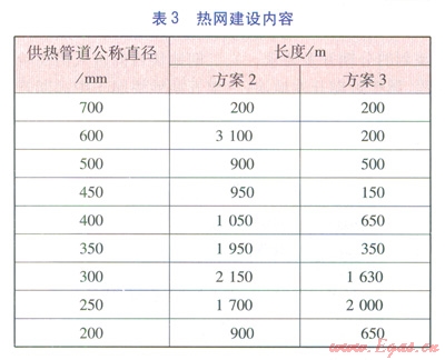 方案l~3各分項工程建設內容分別見表2~6。表3中的熱網(wǎng)指一級管網(wǎng),由于二級管網(wǎng)(包括分散式低溫燃氣鍋爐房至熱用戶的管網(wǎng))造價由用戶分攤,因此不計入熱網(wǎng)造價中。由表2~6可計算得出方案l~3的工程造價分別為35237.74×104、43004.35×104、41047.11×104元。
