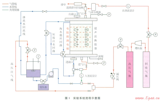 2)根據(jù)設(shè)計方案,建立了物模實驗系統(tǒng)。高壓反應(yīng)釜容積為196L,耐壓32MPa,內(nèi)置30個PTl00A溫度傳感器,30個電阻率探測電極,16對聲偶極子。系統(tǒng)可在典型水合物藏溫壓條件下模擬不同甲烷供氣方式,考察水合物的動態(tài)生成過程以及新鮮海水循環(huán)下的水合物動態(tài)演化行為。