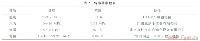 子系統(tǒng)包括溫度、壓力、流量、電阻率、聲速5項參數(shù)的采集與處理,各傳感器參數(shù)見表2。其中,溫度傳感器采用集成鎧裝形式,5個PTl00A級鉑電阻裝入l根316L的Æ6mm鋼管中,結(jié)構(gòu)如圖3所示。