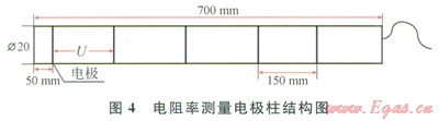 電阻率測量電極柱為自行設(shè)計,尺寸Æ20mm×700mm(圖4)。電極柱桿體材質(zhì)選用聚四氟乙烯,5根鍍銀銅導(dǎo)線在桿體上環(huán)繞一周形成5個環(huán)狀測量電極,相鄰環(huán)狀電極間距l50mm。將相鄰2個環(huán)狀電極接入電路,即可測量環(huán)狀電極間所夾介質(zhì)的電阻,進而可換算出所夾介質(zhì)的電阻率。系統(tǒng)共配備有這樣的測量電極柱6根,共30路測量電極,可測量24路電阻率數(shù)據(jù)。