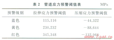 該處管材為X70鋼,管道直徑為1016mm,管道壁厚為14.6mm,設(shè)計(jì)內(nèi)部輸送壓力為l0MPa,按操作和安裝溫差20℃計(jì)算的管道容許軸向附加拉、壓縮應(yīng)力分別為383.72MPa-147.74MPa,相應(yīng)的應(yīng)力預(yù)警閾值如表2所示。