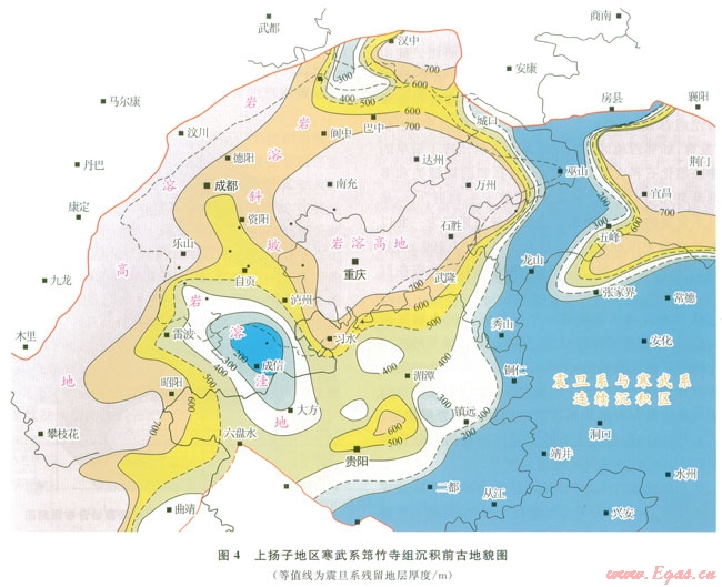 四川盆地腹部?jī)H有少量鉆井鉆遇該層系,且厚度薄,因而這套烴源巖在盆地分布往往不被看好。近期,筆者根據(jù)盆地區(qū)域地震的層位解釋?zhuān)l(fā)現(xiàn)燈影組底界以下的反射層具有向古隆起超覆沉積的特征,層位應(yīng)歸屬陡山沱組。這表明陡山沱沉積期,上揚(yáng)子地區(qū)存在兩個(gè)同沉積期古隆起,分別是黔中隆起和樂(lè)山—龍女寺古隆起陡山沱組烴源巖在古坳陷區(qū)厚度較大,而隆起區(qū)厚度明顯減薄。圖3是筆者根據(jù)地震解釋結(jié)合露頭剖而資料推測(cè)的陡山沱組烴源巖分布圖。從圖3可以看出,資陽(yáng)古隆起兩側(cè)的川西、川東地區(qū)均存在陡山沱組烴源巖,厚度在20~60m。這一認(rèn)識(shí)大大提升了震旦系含油氣系統(tǒng)的資源潛力。