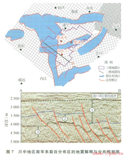 根據(jù)對(duì)川中地區(qū)震旦系燈影組以下層位的地震反射特征解釋?zhuān)梢赃M(jìn)一步識(shí)別出裂谷形態(tài)及分布特征。圖7可以看出在南充—遂寧之間、磨溪地區(qū)存在近東西向裂谷,而高石梯以西存在近南北向裂谷。根據(jù)3D地震反射特征,可以將裂谷區(qū)充填地層劃分為3的反射層組(圖7)。①反射層組為較連續(xù)反射,成層性好,厚度變化較大,地震反射時(shí)間介于600~1300ms;②反射層組為斷續(xù)反射,底界反射波組連續(xù)性較強(qiáng),可能是某個(gè)地層界面的反射特征;③反射層組為雜亂反射。從解釋的斷裂來(lái)看,既有正斷層也有逆斷層,反映裂谷區(qū)經(jīng)歷了復(fù)雜的構(gòu)造演化歷史。當(dāng)然,區(qū)內(nèi)的地震解釋方案尚沒(méi)有得到鉆井證實(shí),有待進(jìn)一步深化研究。