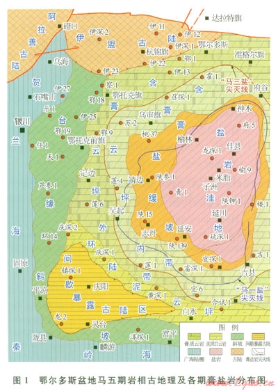 鄂爾多斯盆地奧陶系馬家溝組發(fā)育巨厚的膏鹽巖沉積地層,按照沉積旋回劃分,其主要分布在下奧陶統(tǒng)馬家溝組馬一、馬三、馬五段3個海退期沉積層序中[1-3]。其中馬五段是馬家溝組最后一期蒸發(fā)旋回形成的沉積地層,內(nèi)部又可進一步細分為馬五10、馬五8、馬五6、馬五4亞段等4個主要的膏鹽巖層段,尤以馬五6亞段的膏鹽巖分布范圍為最廣,面積約5×l04km2,主要分布在盆地中東部的陜北米脂鹽洼沉積相區(qū)(1)。因而,通常所言奧陶系鹽上和鹽下地層均以馬五8亞段為界劃分。
